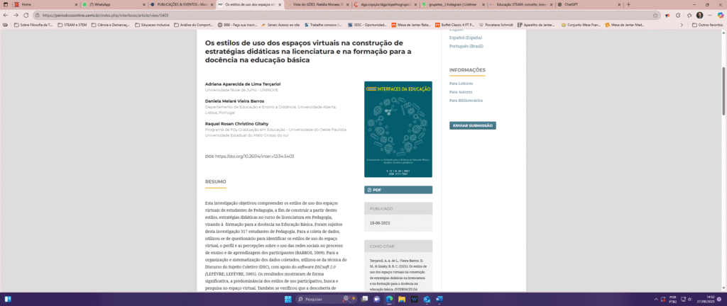 | Terçariol, A. A. L.; Barros, D. M. V. ; Gitahy, R. R. C. Os estilos de uso dos espaços virtuais na construção de estratégias didáticas na licenciatura e na formação para a docência na educação básica. Interfaces da Educação, V. 12, P. 986-1014, 2021. |